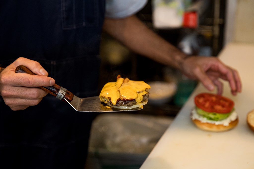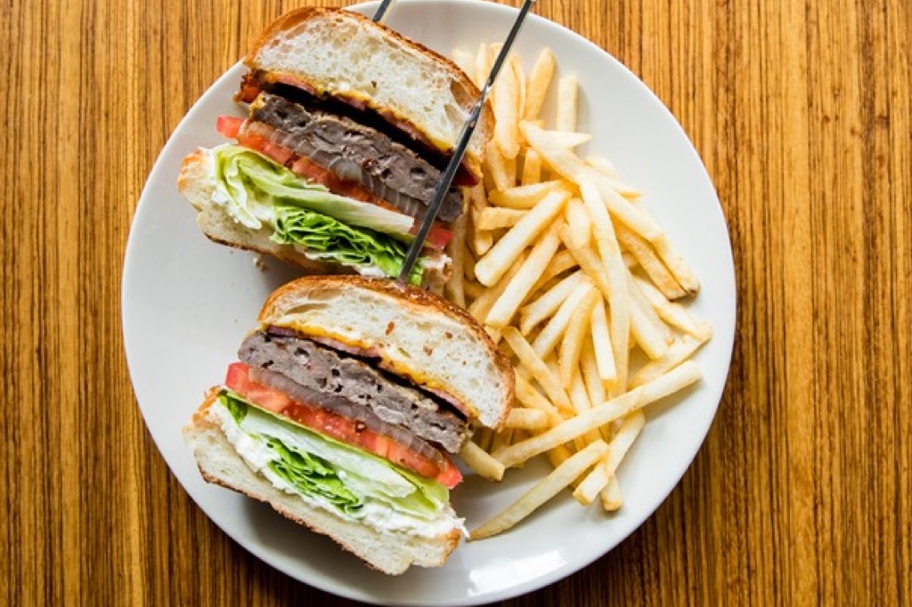 外にはパラソルが設置されたテラス席が設けられ、ペット同伴も可能。ランチタイムは、バーガー、フレンチフライ、ドリンクのセットが定番メニューで多くのファンに愛されている。
