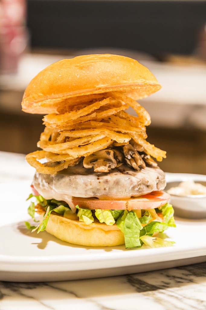ソテーしたマッシュルームとオニオンフライの食感が新しいこのハンバーガーは、高さが16センチもあり、そのまま頬張るのはほぼ不可能。ここはアメリカ人のようにナイフとフォークで上手に食べてほしい。