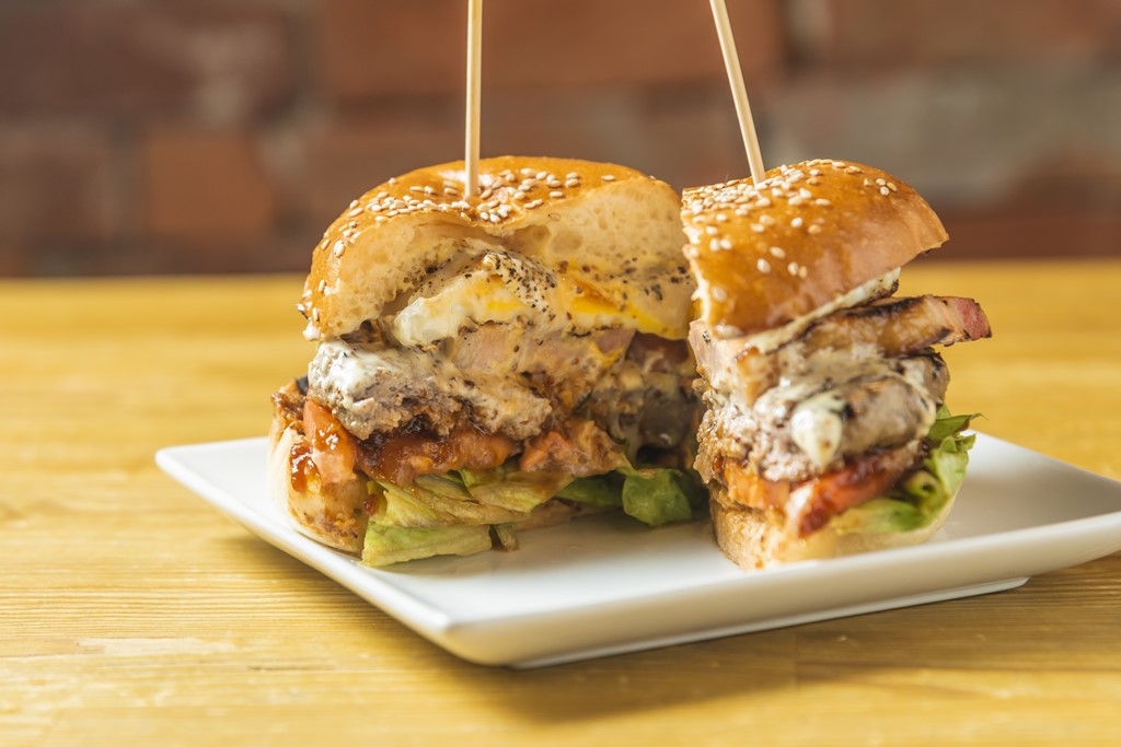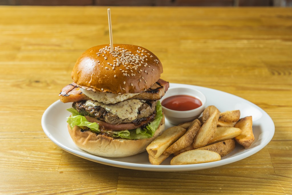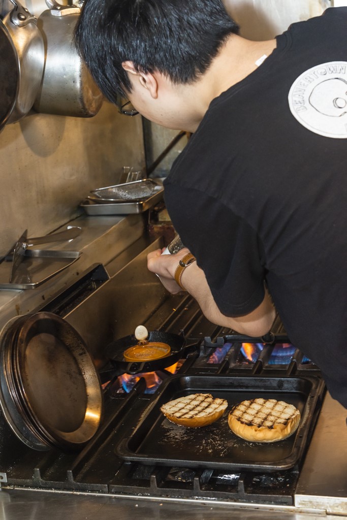 老舗パン店に特注したオリジナル配合のバンズをオーブンで全体的にカリッと焼く。パティはオーストラリア産のアンガス牛100%を使用。ゴロっとした肉の塊が混ざる粗挽きタイプ。そのほかスモークベーコンやスモークエッグなどとてもボリューミー。自家製バーベキューソースがクセになる。1050円