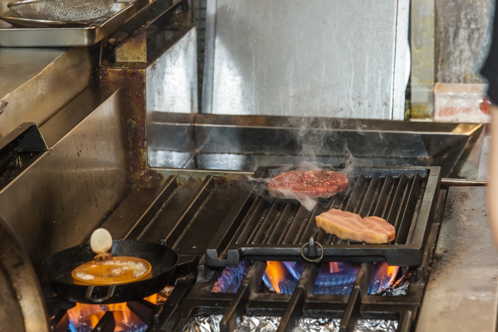 波型鉄板で焼かれるパティとベーコン。ピートスモークの香りと強火で焼かれた芳醇な香りが、間違いなくクラフトビールを欲してしまう。