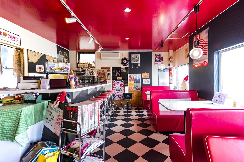 赤と黒と白を基調としたダイナーを再現した明るい店内。クラップスダイナーのオーナー藏田泰輔さんは元ホテルの中華の料理人で、現在はこの店と共に、地元のFM局でパーソナリティも担当するというユニークな経歴の持ち主。