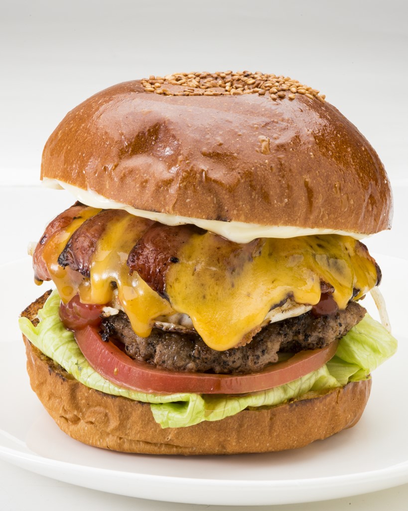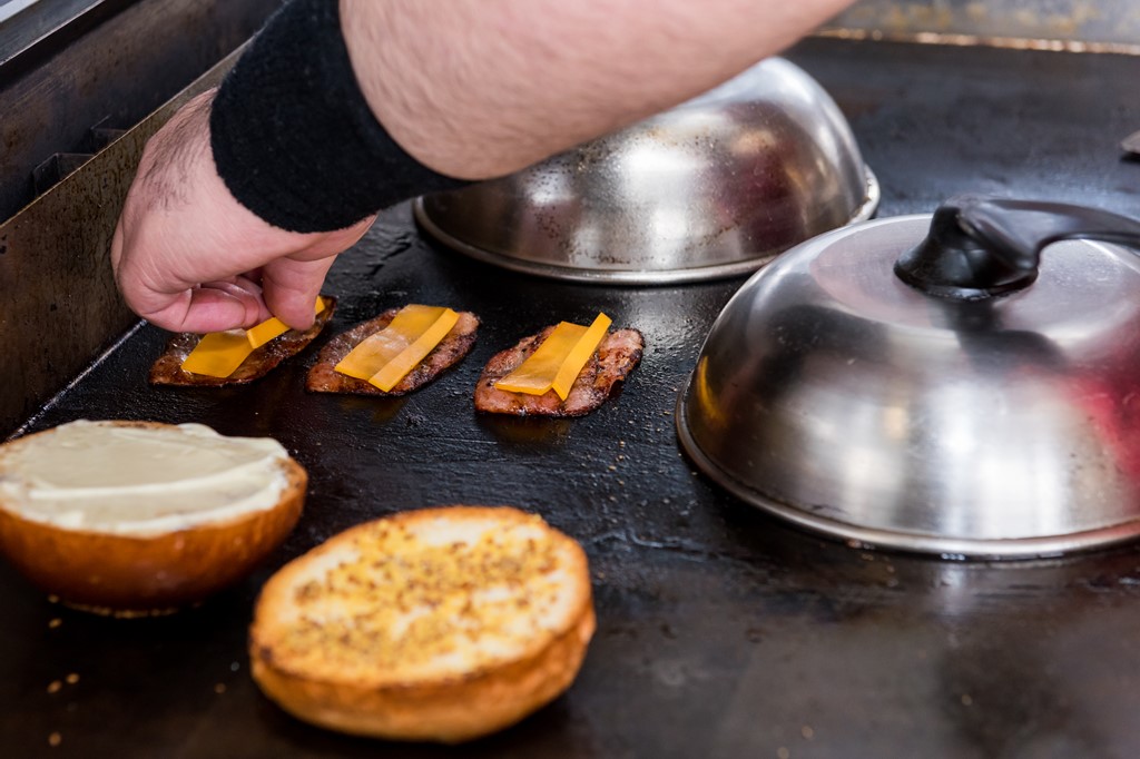 バンズは両面を軽く焼き、さらに一枚一枚丁寧に焼いたベーコンに濃厚なチーズをのせ加熱する。
