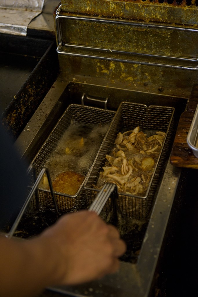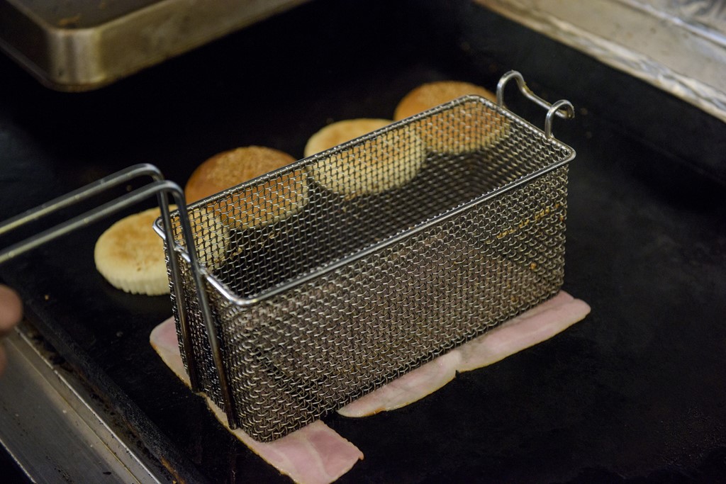 肉やベーコンと同時にバンズもオープンではなく鉄板でこんがりと両面焼き する。サクッじゅわ~なフライドオニオンとの食感も楽しんで。