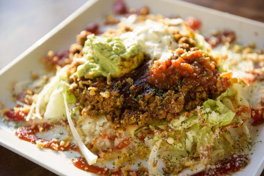 ハンバーガーに合わせたいソフトドリンクも充実。メキシカン風にアボカドとサワークリームが入った次世代タコライスもおすすめの一品。