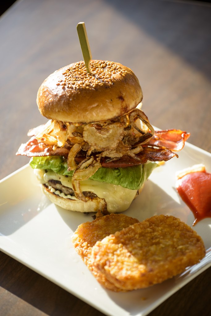 ジューシーなパティにカリカリに焼いた香ばしいベーコンと甘辛なフライド オニオンをトッピングしたここでしか食べられないバーガー。味の決め手はなんといってもオリジナルソース。野菜がたくさん入っているのも嬉しい。1200円