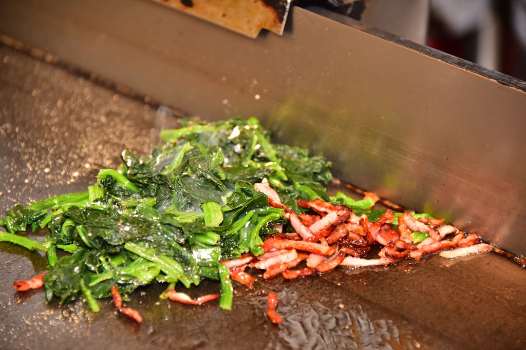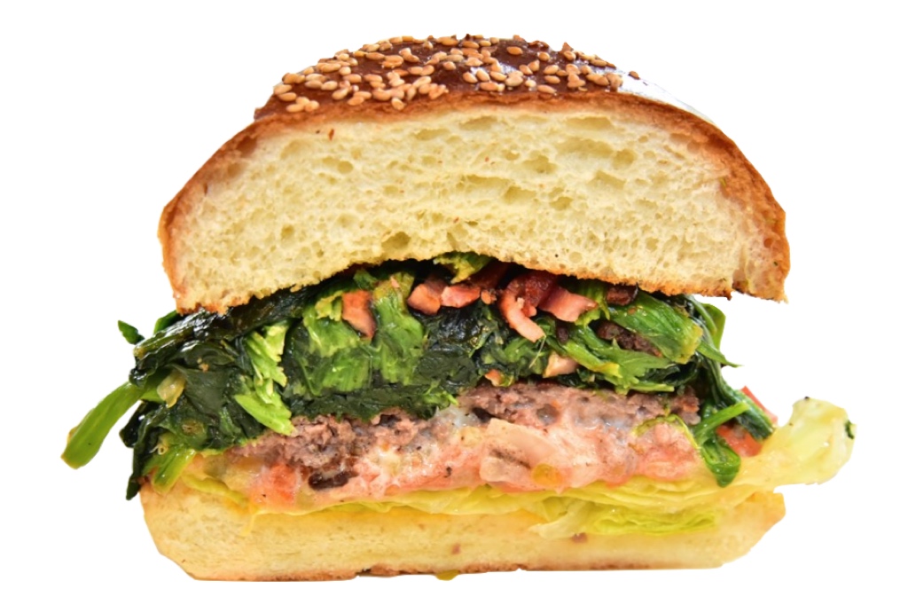 たっぷりのほうれん草と細かく刻んだベーコンをじっくり手早く炒める。ガーリックパウダーの香りが鼻孔をくすぐり、食欲増進。パティや野菜、バンズと合わないわけがない!