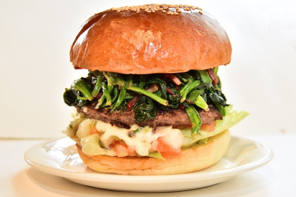 数あるハンバーガーの中でも最も人気なのが、ほうれん草とベーコンを炒めて、パティに乗せたポパイバーガー。オリジナリティのあるバーガーを作りたいと思いついたのが、海外でも人気の食材、ほうれん草だった。塩コショウとガーリックパウダーの風味がよく効いて、ボリュームがあるにも関わらず軽い口上がり。肉との相性抜群で、リピート間違いなし。