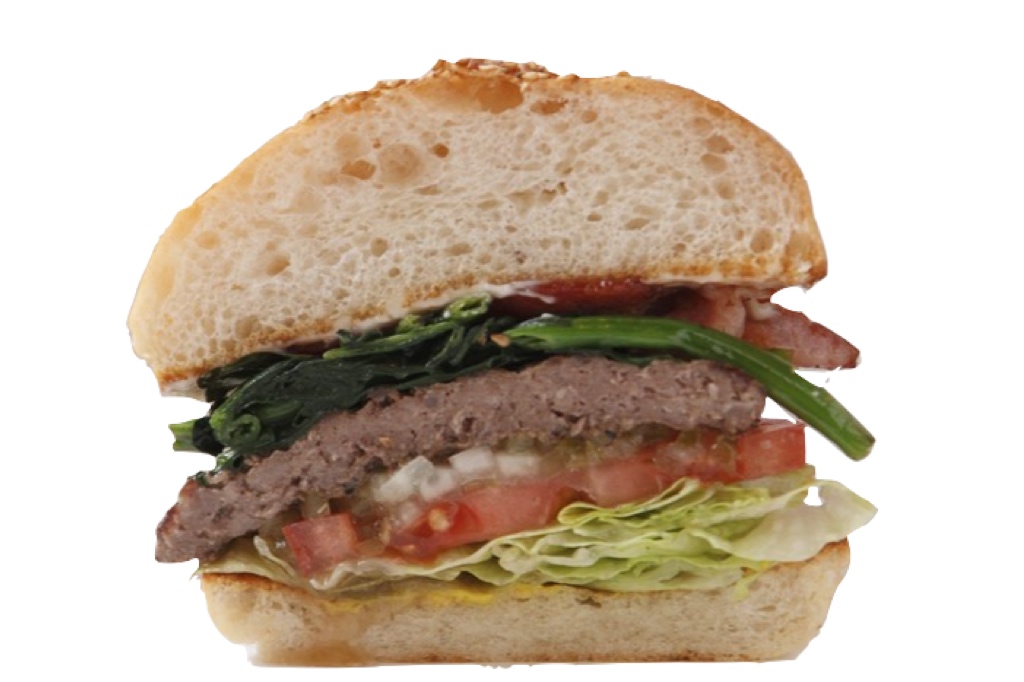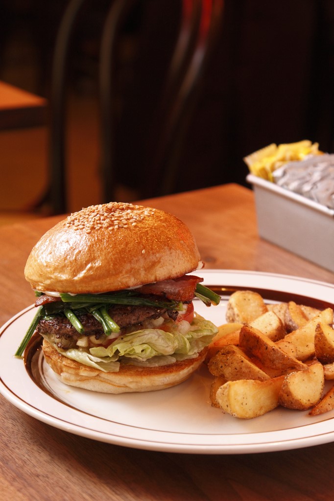 国産小麦を使用し天然酵母でゆっくりと発酵させた、オリジナルバンズ。国産牛の牛脂をブレンドしたオージービーフの粗挽きパティを使用。そこにバターでソテーしたほうれん草とレタス、トマト、ピクルスと玉ねぎのレディッシュをトッピング。ヒールにはマスタード、クラウンにはマヨネーズを塗り、さらにベーコンを加えたバーガー。1600円