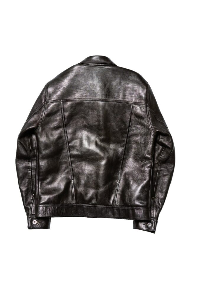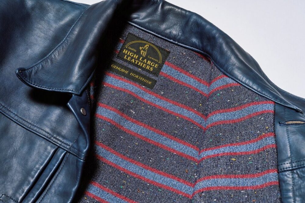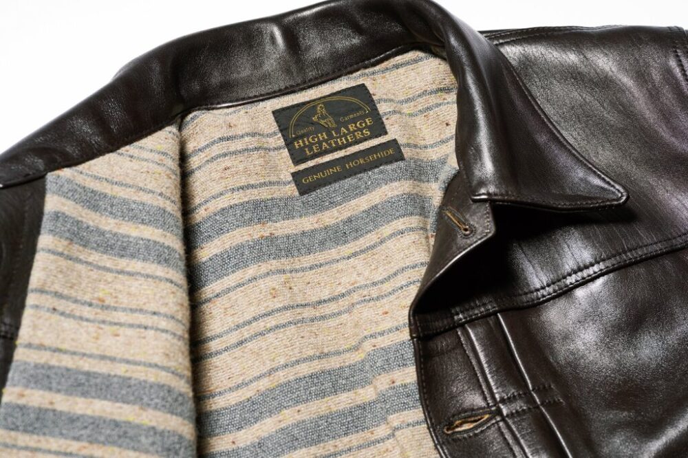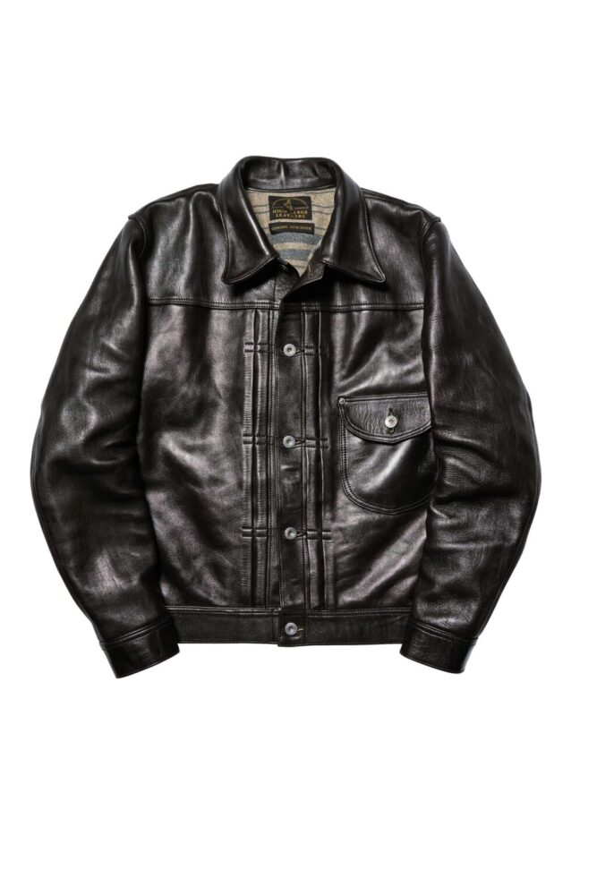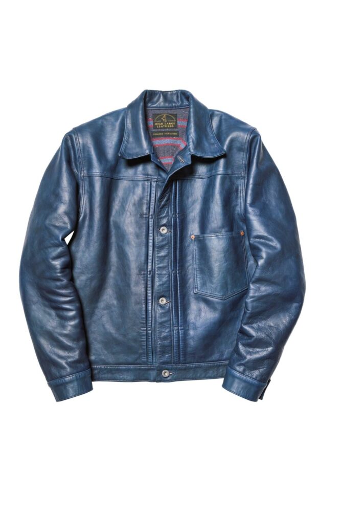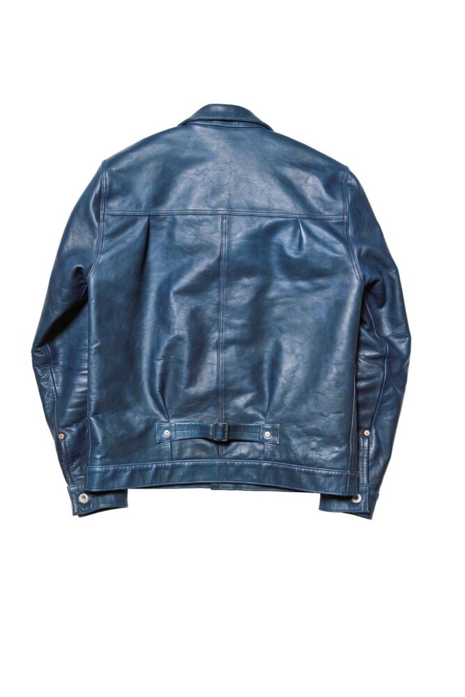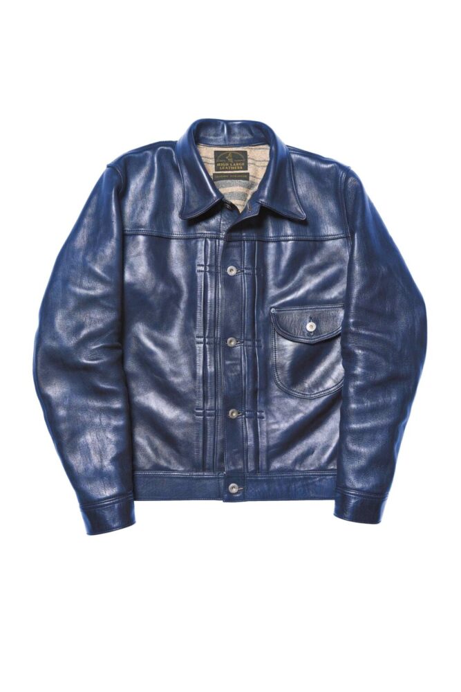 天然藍で染めた1.2mm厚のベジタブルタンニン鞣しの馬革を採用し、独特のエイジングが堪能できるハイラージレザーズの意欲作。いわゆるファーストタイプの大戦モデルにブランケットのライニングを付け、独自のモデルを作り上げた。もちろん実際に大戦モデルのブランケット付きは存在しないが、ブランケット付きの通常のファーストタイプの意匠を取り入れ、再構築している。ヴィンテージに稀にみられる一枚袖の仕様にも注目したい。49万9950円