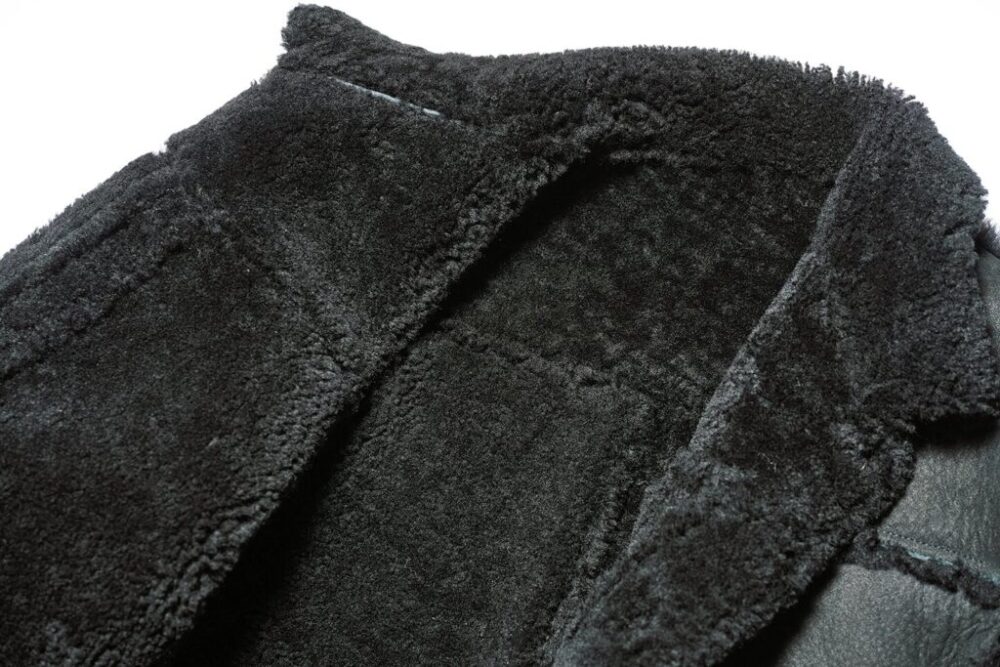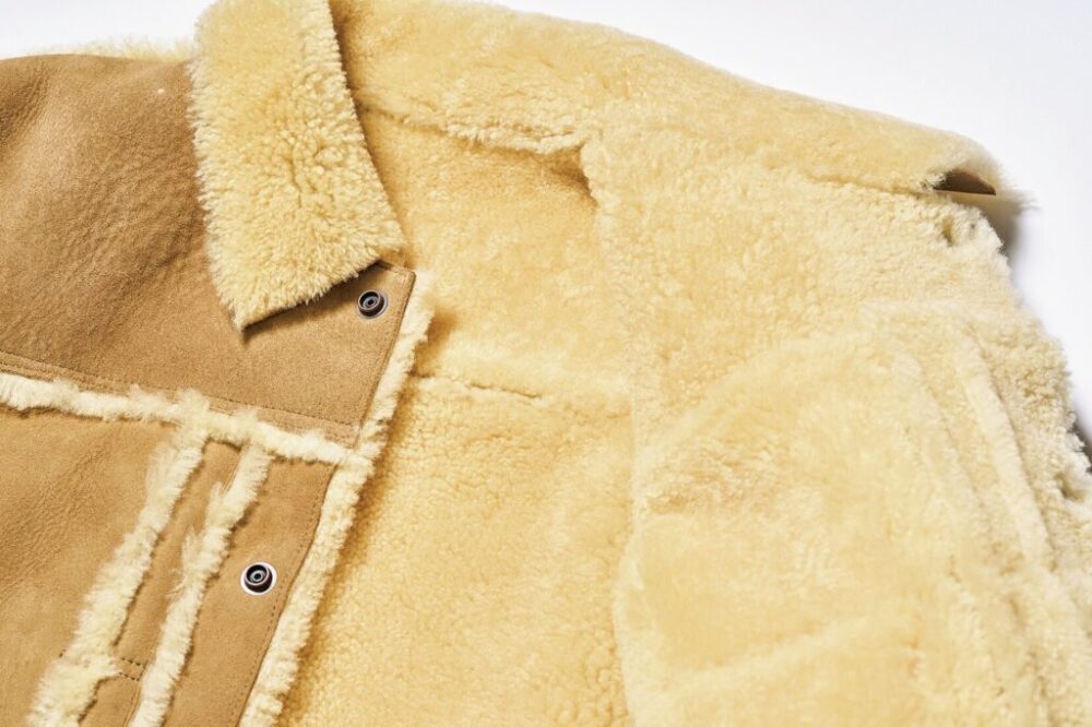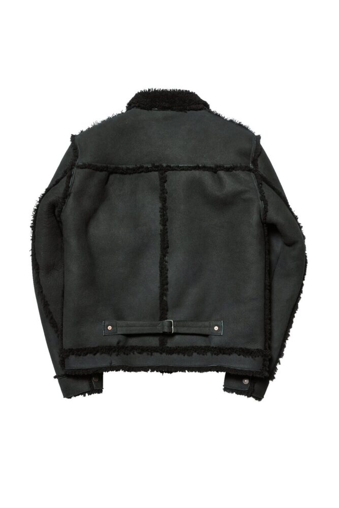 上のモデルと同じデザインながら、ブラックカラーで引き締まった印象を受ける。2.3mmのムートンを採用しており、毛の部分をカールさせているのが特徴的だ。カールすることでボリューム感が出て、着用時に体に密着するため、より暖かくなるのだ。ムートンでGジャンタイプを作るにあたり、パターンにもこだわっている。体に沿うように作られており、大き過ぎずタイトに作られているため、スタイリッシュなシルエットを実現した。34万9910円