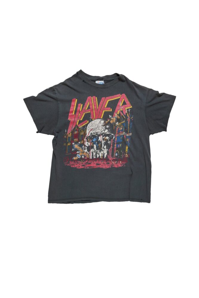 スラッシュメタル・バンド、スレイヤーの1着。’90年代製のHANESボディで、褪色とダメージがバンドイメージとリンクして雰囲気倍増。色の薄いブルージーンズに合わせたい。2万2000 円( ドロップ TEL03-3463-6086)