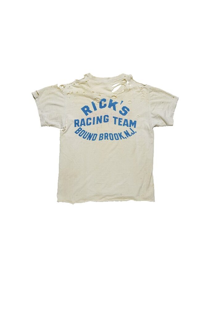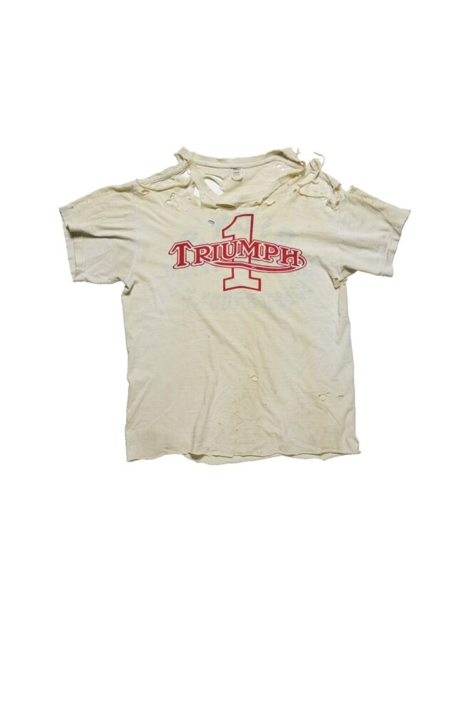 ’60年代のモノと思われるTRIUMPHの販売店のTシャツ。かなりダメージがあるが、綺麗な白or赤or青のTシャツをインナーに合わせるとカッコよく着られる。1万5400円(ジレ アンティークス TEL03-5467-5568)