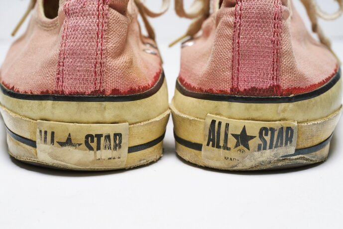 サイドにある補強用のステッチやインソールのロゴデザインから’80年代の銀箱とわかるコンバースのオールスターロー。レッドが日焼けしてピンクに変色している。1万5900円(ロンガブ TEL03-5377-0558)