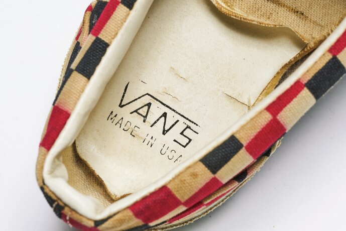 VANSの名作スリッポンは、希少なメイドインUSAの’70年代もの。王道のチェッカーフラッグだが、堅牢度が低く、赤が移染しているが、それがまたいい味に。シャープなラストも◎。4万9500円(ミスタークリーン TEL090-2206-1755)