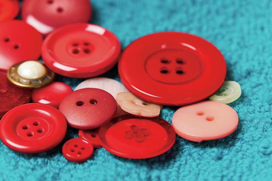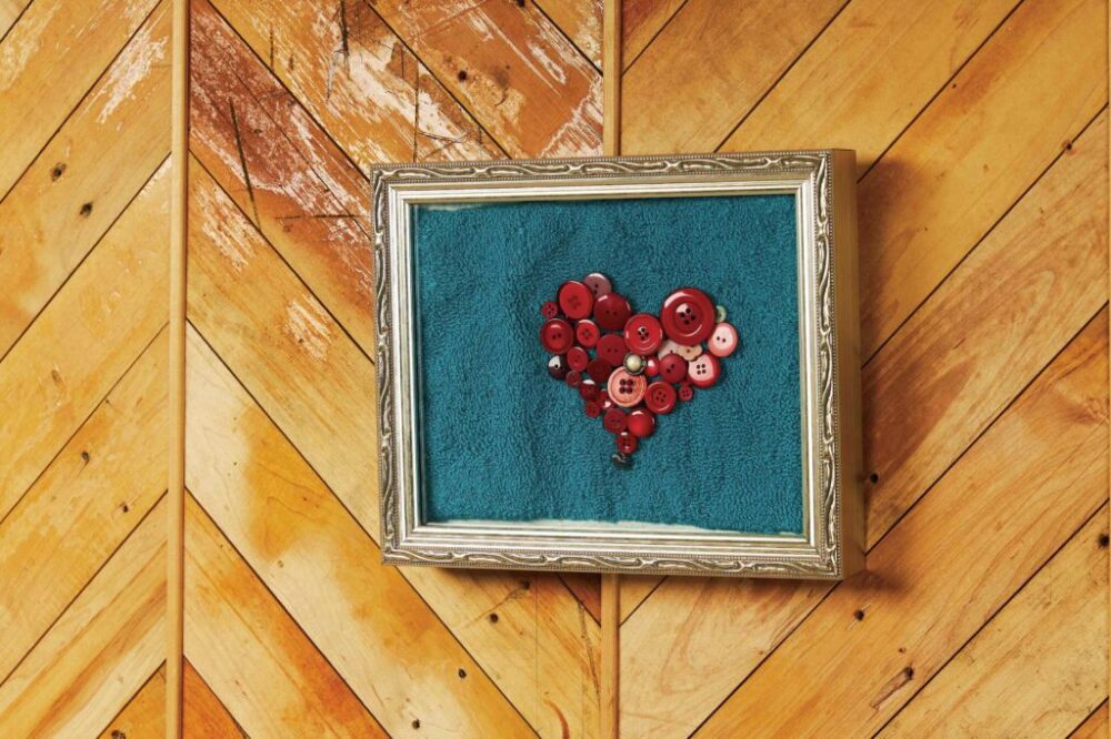 背景は、以前スタジャンカスタムをしたときに使ったパンチニードルで全面にステッチ。スタジャンのときほどではないが、なかなか途方もない作業。そこに今どきっぽく赤系のボタンでハートを描いてみた。仕上がりはというと……ちょっと微妙。もうちょっとうまくできるはずだったのにな。