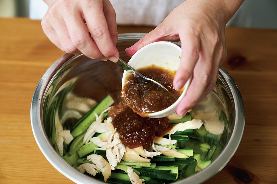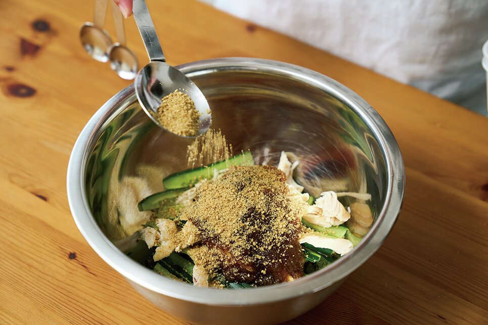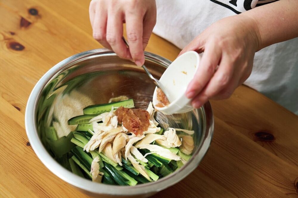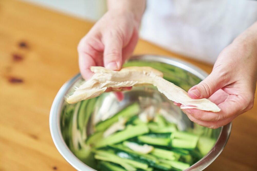きゅうりは細くカットし、焼いて冷ましておいた鶏ささみは手で割いてボウルに入れる。