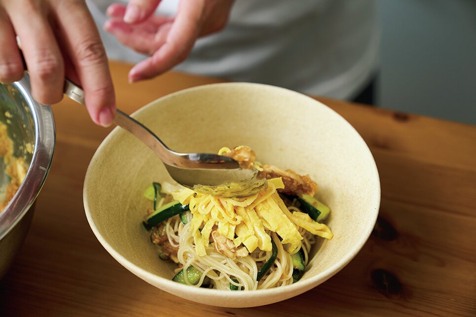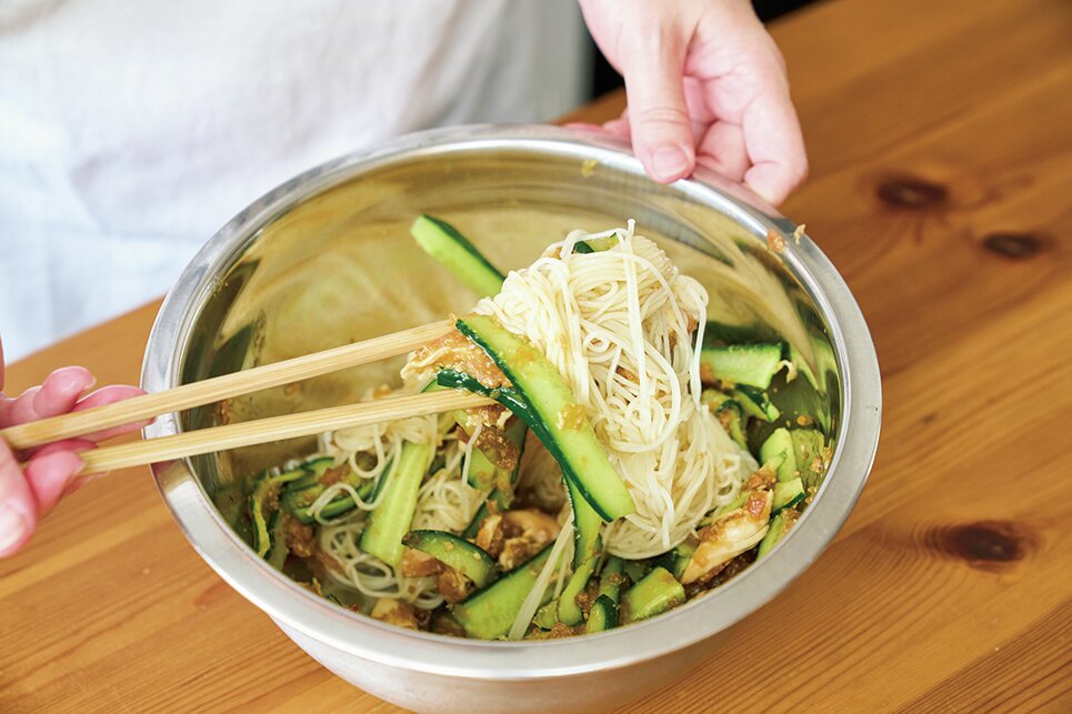 茹でて氷でしめたそうめんを加え、具材が絡むようによく混ぜる。