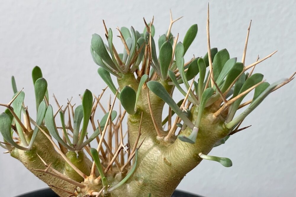 黒い肌と棘が特徴的なユーフォルビオイデス。この棘は花が咲いた後に残る花茎が硬化したもので、開花の回数を重ねることで棘の本数も増えていきます。