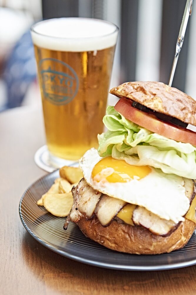 アメリカンなベーコンエッグチーズバーガーはバンズに塗り込んだ麦芽の絞りカスが隠し味。