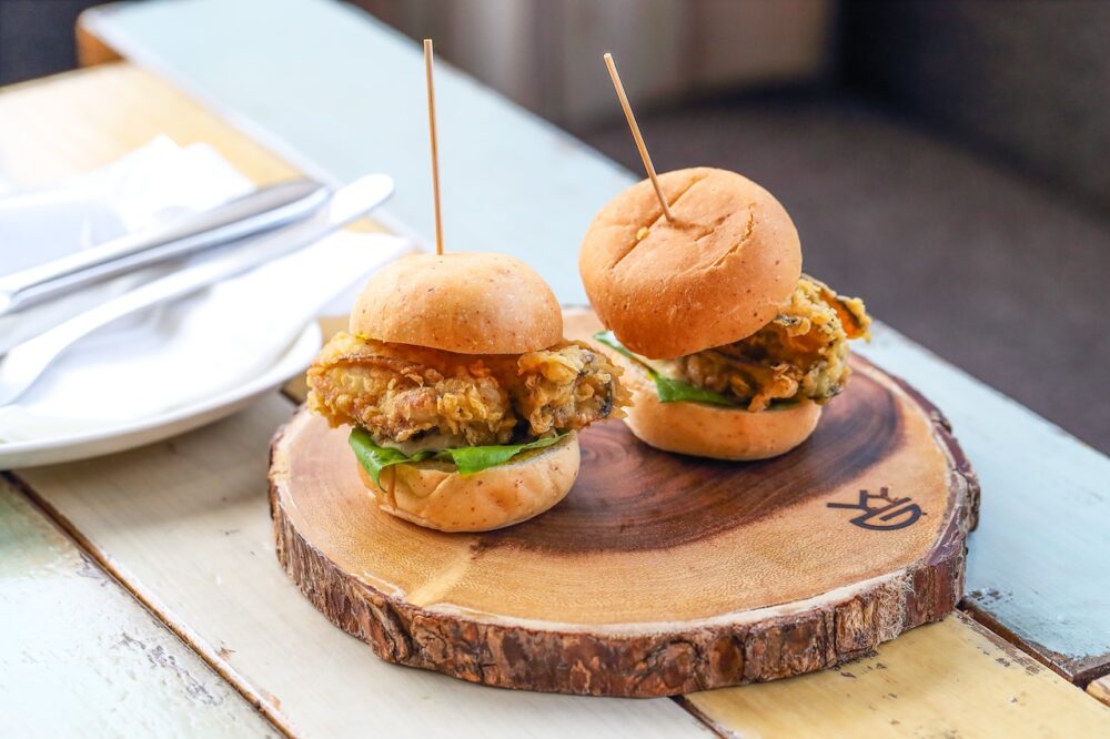 カキの濃厚な旨味には、すっきりとした口当たりのビールがバランス良し。広島産大粒カキのNY風miniオイスターバーガーは2個から注文可能。1個660円