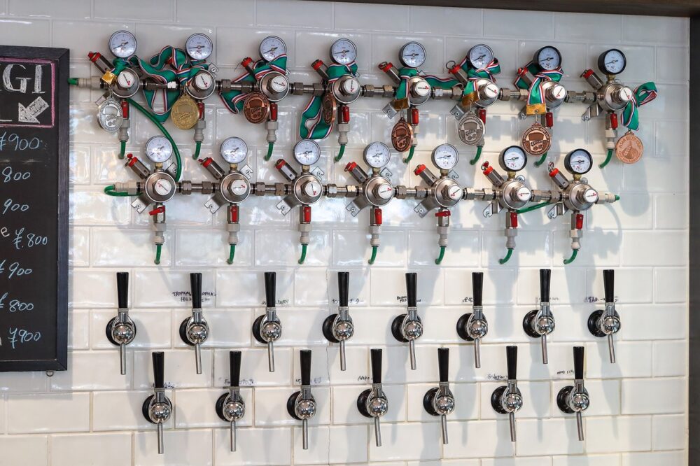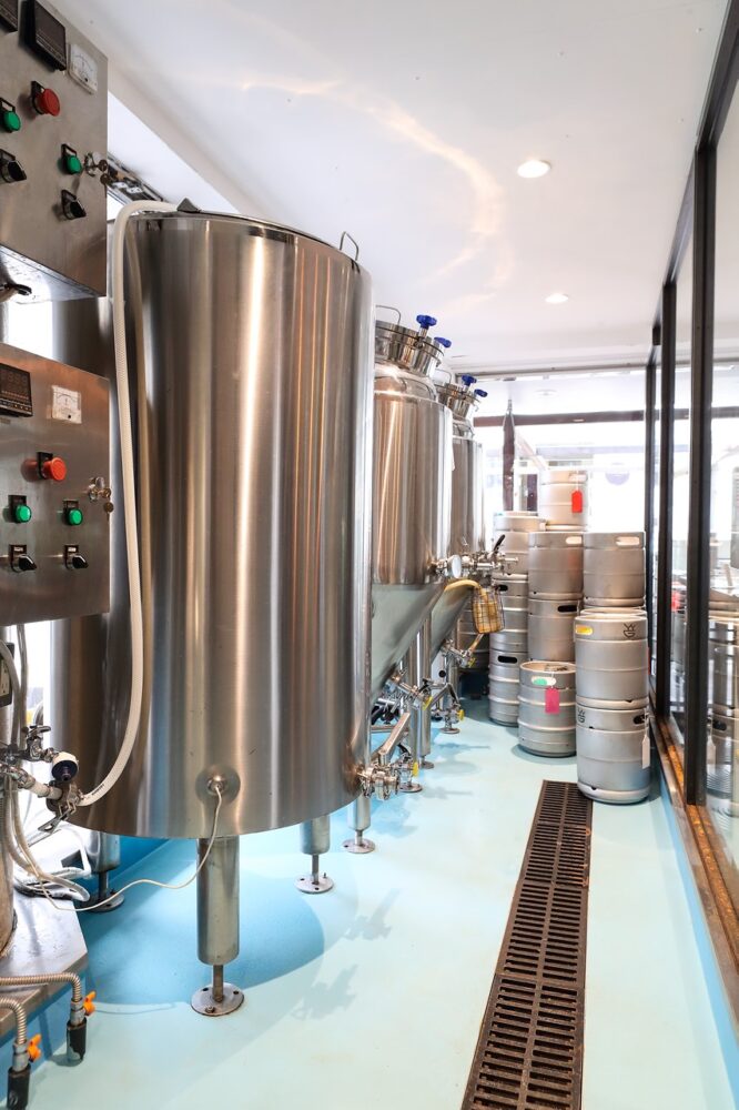 1階はバーフロアで、圧倒的な存在感を放つタンクが鎮座した醸造設備を併設。そこでは300ℓのクラフトビールを月に3回ほど醸造。さらに、2019年に千葉県の本千葉駅前にオープンした系列店Y.Y.G.ファクトリーは、700ℓを毎週醸造し、こちらでもサーブする。