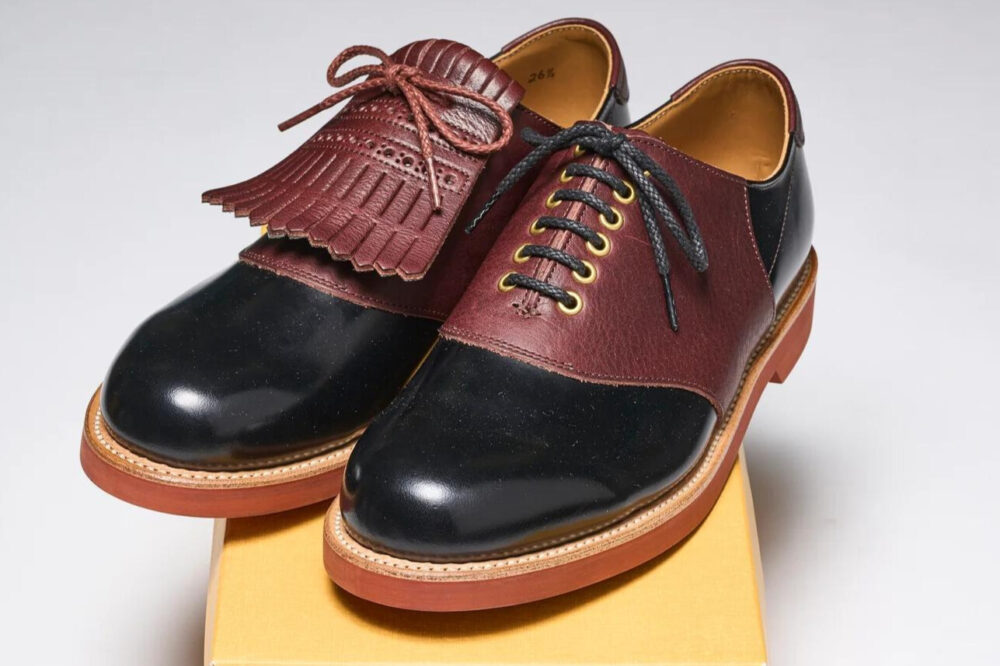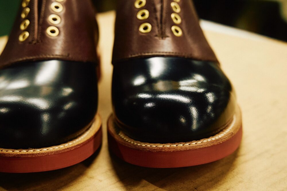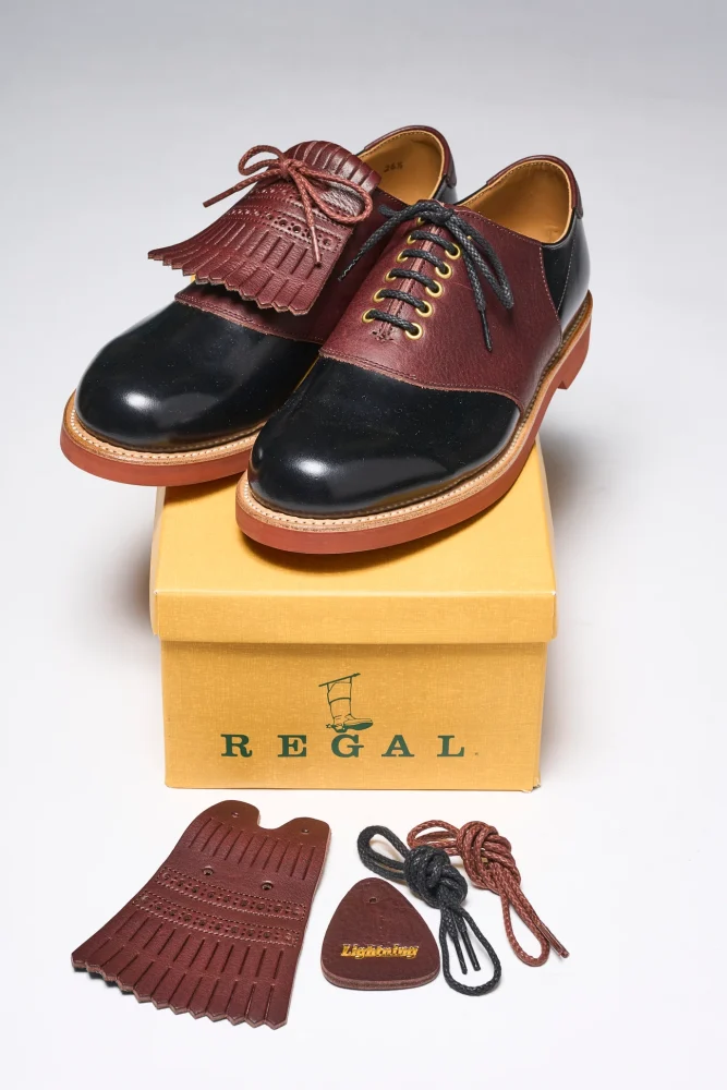 元になった木型と完成品のサドルシューズ。雑誌『Lightning』編集部のわがままをめいっぱい詰め込んだ特別仕様だ。通常は使われない栃木レザーをサドル部分に採用するほか、同じく栃木レザーを使用したキルトを付属、ヒール部分のT字型バックステーを採用するなど、REGAL史上初となるアイデアも盛り込んだかつてない別注アイテムとなっている。
