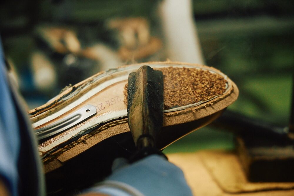 また、中底と表底の間にはクッション材を敷くのだが、そこには「練りコルク」を使っている。本格革靴といえども、板状のコルクや他の素材を使っているものがほとんどのなか、トラディショナルな練りコルクを使ってサドルシューズを作っている現場を見ることができるなんて! 製品になってからでは確認できない隠れたこだわりを垣間見られるのは取材班の役得。そのこだわりを少しでもお伝えられたなら本望だ。