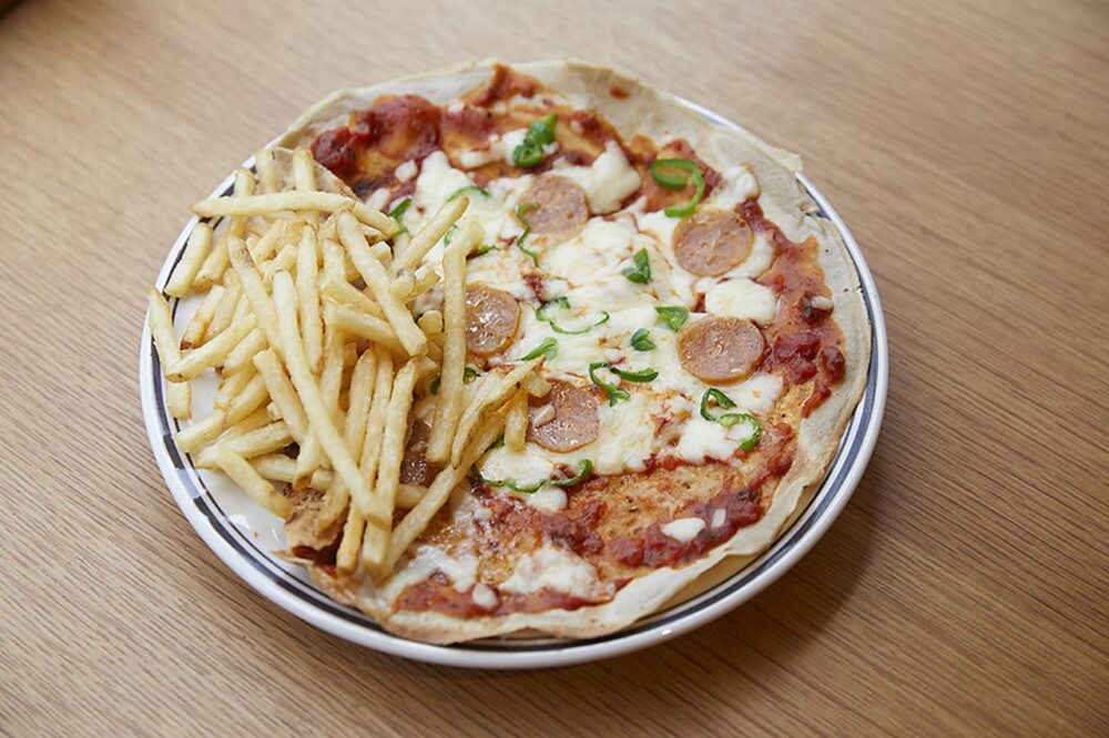 ランチで提供しているピザガレット。蕎麦をクレープ状に焼いたガレット生地とピザソースの相性がいい。ライトにサクサク食べられる。