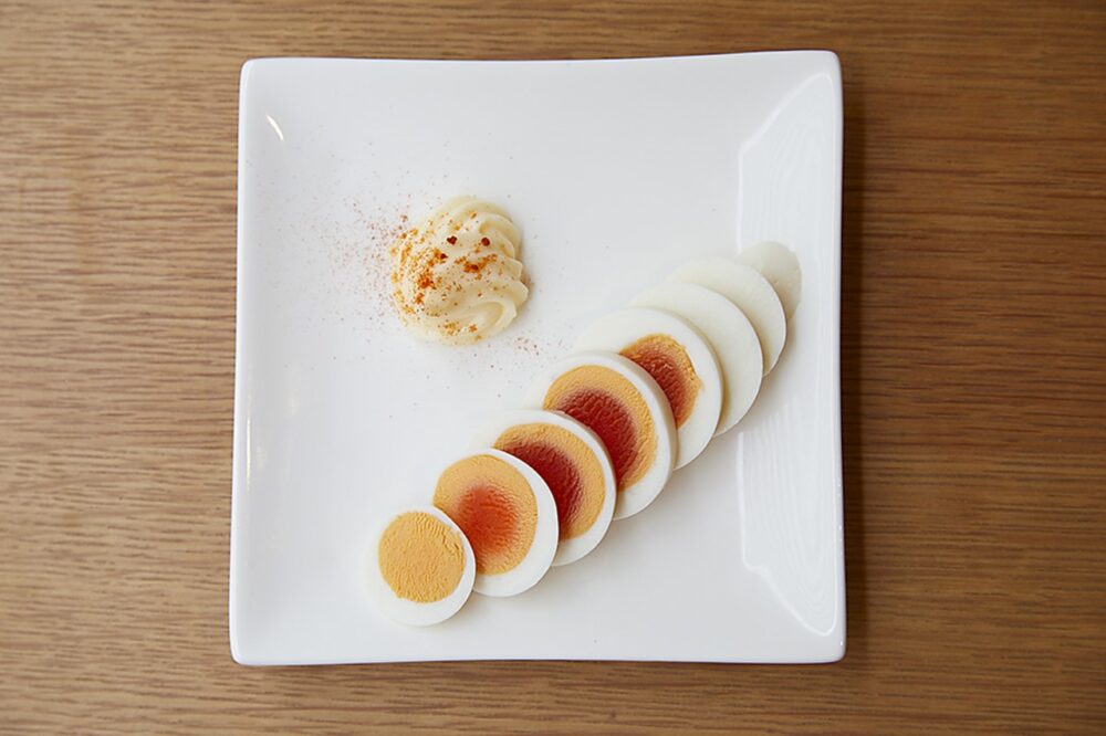 イサナブルイーングのビールで作ったピクルス酢に漬けた半熟卵。ほのかにビールの香りが感じられIPAとよく合う。