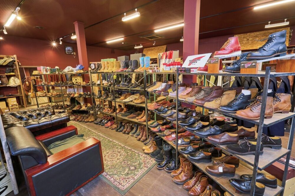 2階フロアには、革ジャンだけでなくブーツや革靴なども多数陳列。名だたるワークブーツブランドだけでなく、綺麗めな革靴までも豊富にラインナップするのがBARN STORMER & CO.のすごいところ。