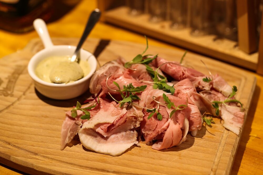 ソムリエの資格も持つフレンチ出身のシェフが作る、ビールに合う料理は絶品。モルトウォーター(かす取り麦汁)でボイルした自家製のもち豚ハム。