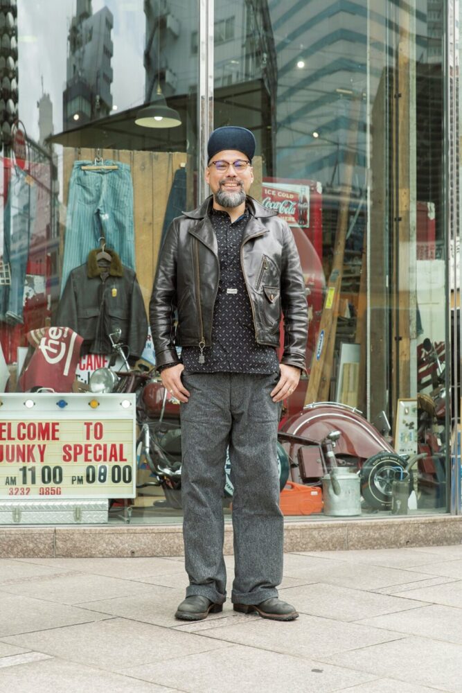 新宿にある人気セレクトショップであるジャンキースペシャルの看板スタッフである西さん。日本人離れした風格とスタイルで着こなしているのは、7年ほど着込んでいるシュガーケーンのホースハイドダブルアビエイタージャケットである。