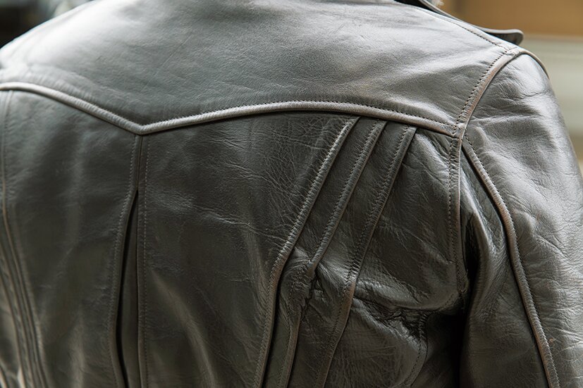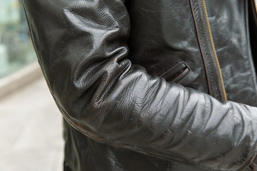特別なメインテナンスはせず、とにかく着込んでいます。品質の高いホースハイドを使っているので、シワは言わずもがな、美しい光沢感が出てきていますね」