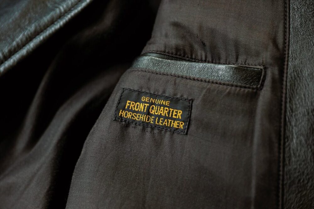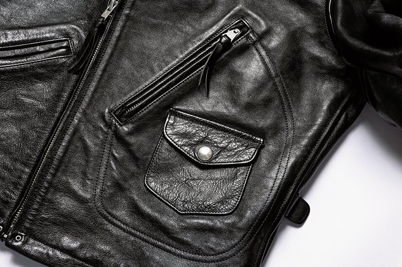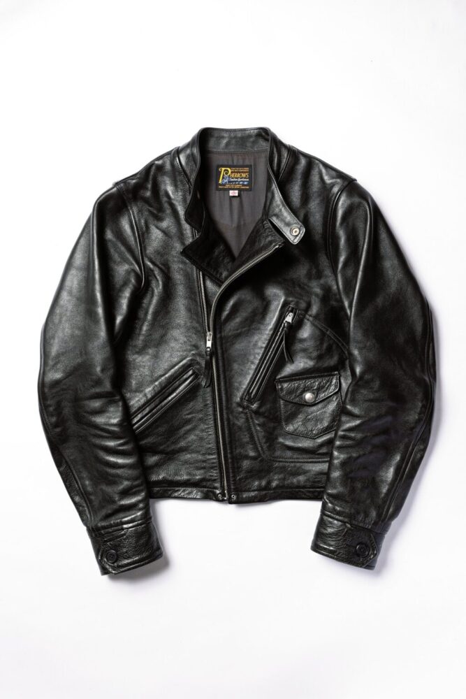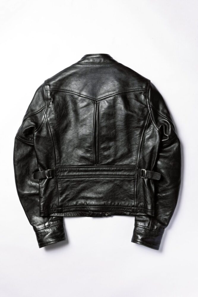 ライダースの黎明期を彷彿とさせるアビエイタースタイルのスポーツジャケット。芯染めした黒のホースハイドを使っているため、より強い光沢感を放っている。