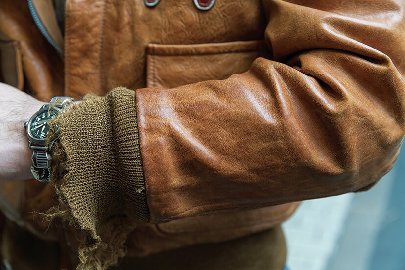 これはブロンハイドをハンドダイしたものなので、当初は美しいシールブラウンでしたが、見事にここまで経年変化しました。こだわりとしては、同社のB-10に付いていたワッペンをうまく移植して、自分だけの特別なカスタムモデルにしたことです。さすがに着すぎて、リブ部分がダメになってきましたが、レザーはまだまだ現役なので、これからも愛用したい大切な1着です」