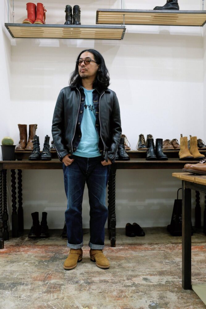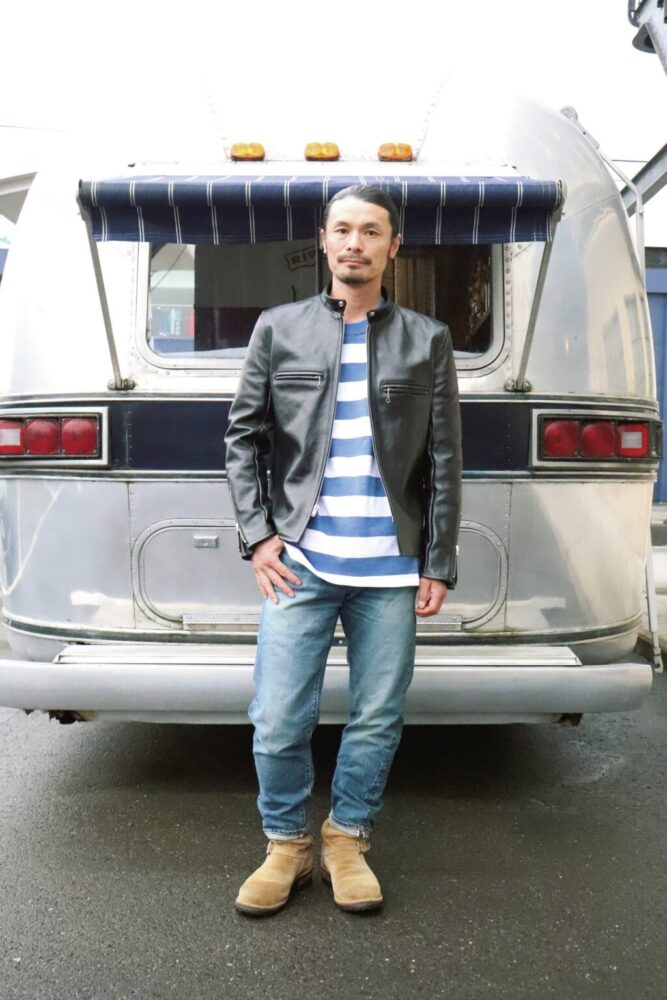 郡山にあるアメリカンクロージングの名店JOB314のバイヤーも務める山住さんは、BUCOの名作であるシングルライダースのJ-100を着用。インナーにはあえて爽やかなブルー×ホワイトの同ブランドのボーダーカットソーを着ているのが、さすがである。