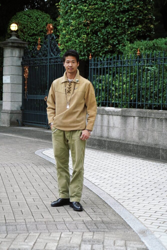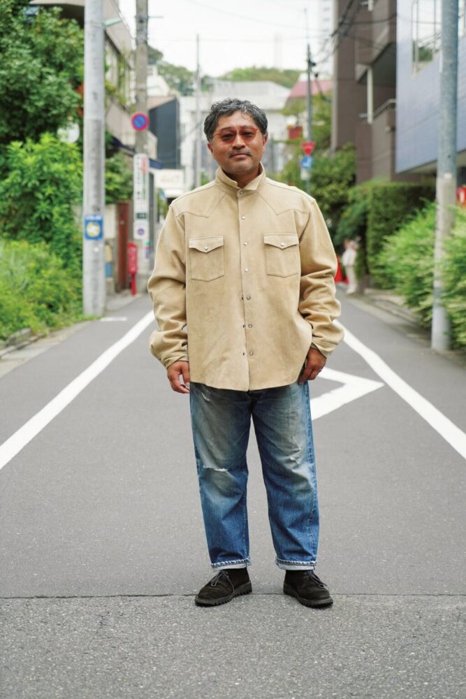 ミリタリーのスペシャリストとしても知られ、20代のショップスタッフ時代からウェルドレッサーとしても評価されている加瀬さん。この日は、90年代のポロスポーツのスウェードシャツに501Eという王道コーデ。足元をクラークスでうまくハズしている。