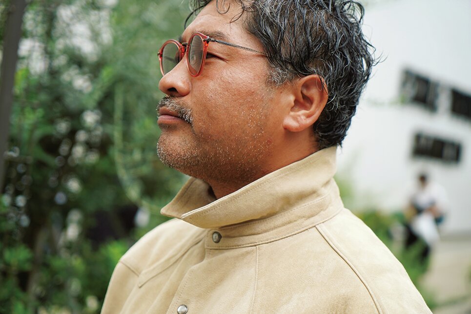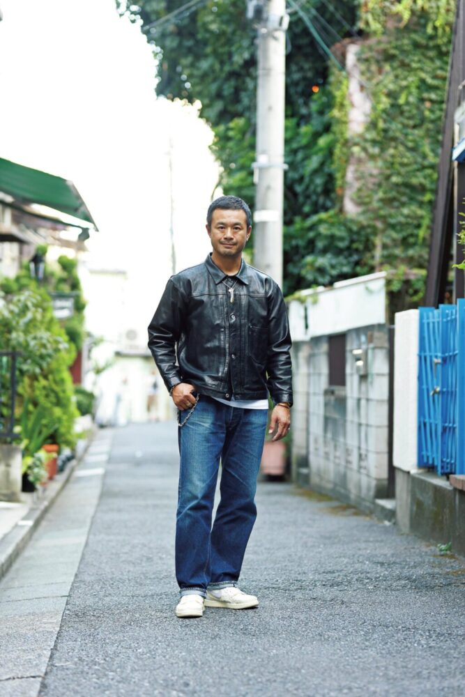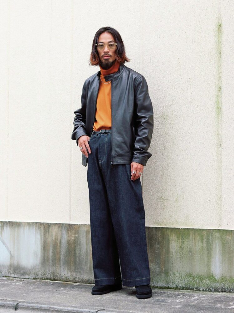 ヴィンテージデニムアドバイザーとしてワールドワイドに活躍する藤原裕さんと、ファインダーズキーパーズのコラボレーションによるレザージャケットを着用。藤原さんのアイコンでもあるTバック仕様の大戦モデルをモチーフにしたデザインが秀逸だ!