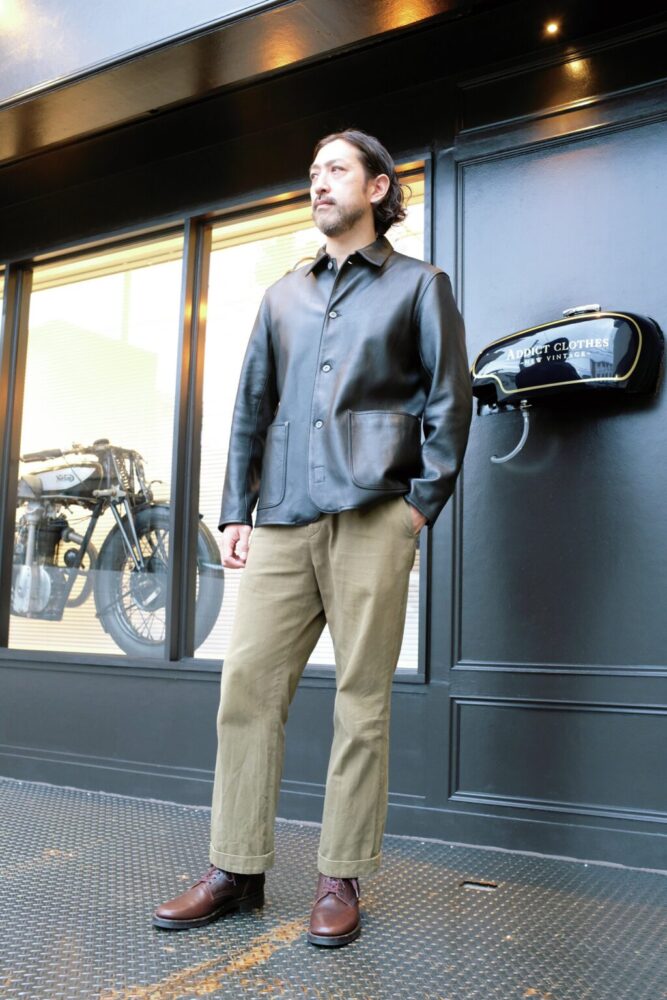 ワーク色のあまり強くない1940年代のカバーオールを軽量なタンニン鞣し・茶芯仕様のシープスキンで製作したLJK-03を羽織り、上品なスタイルを構築した石嶋さん。特筆すべきは全体の色使い。シックなカラーでまとめつつ、寂しくならないバランス感は、是非とも参考にしたい。
