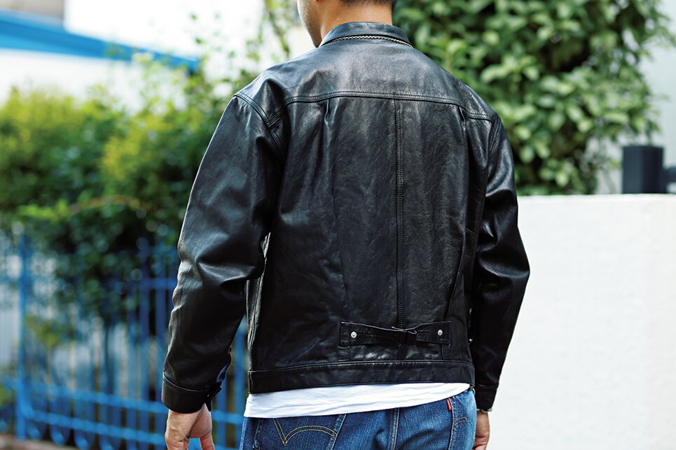 このAD-01は着心地のいいディアスキン製。オーダーして作ったというだけあり、絶妙なサイズ感を見せている。インナーにはデニムジャケットを合わせ、またライトブルーのTシャツを合わせることで、重苦しくならずに、軽快な印象と適度の“ヌケ感” をプラスしている。