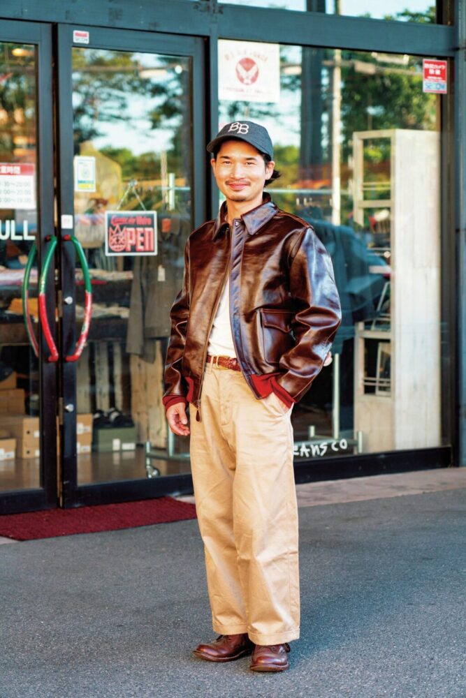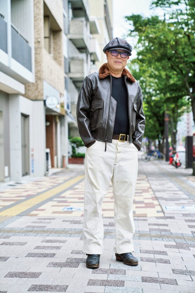 ムートン襟が醸し出す、無骨さの中に漂う色気が魅力だと語る、広島県にあるアメカジショップ「ホワイツウルフ」オーナーの長岡さん。ジャケットやインナー、小物が濃い色味なのでホワイトのワークパンツを合わせて程よいヌケ感を演出した着こなしを披露。
