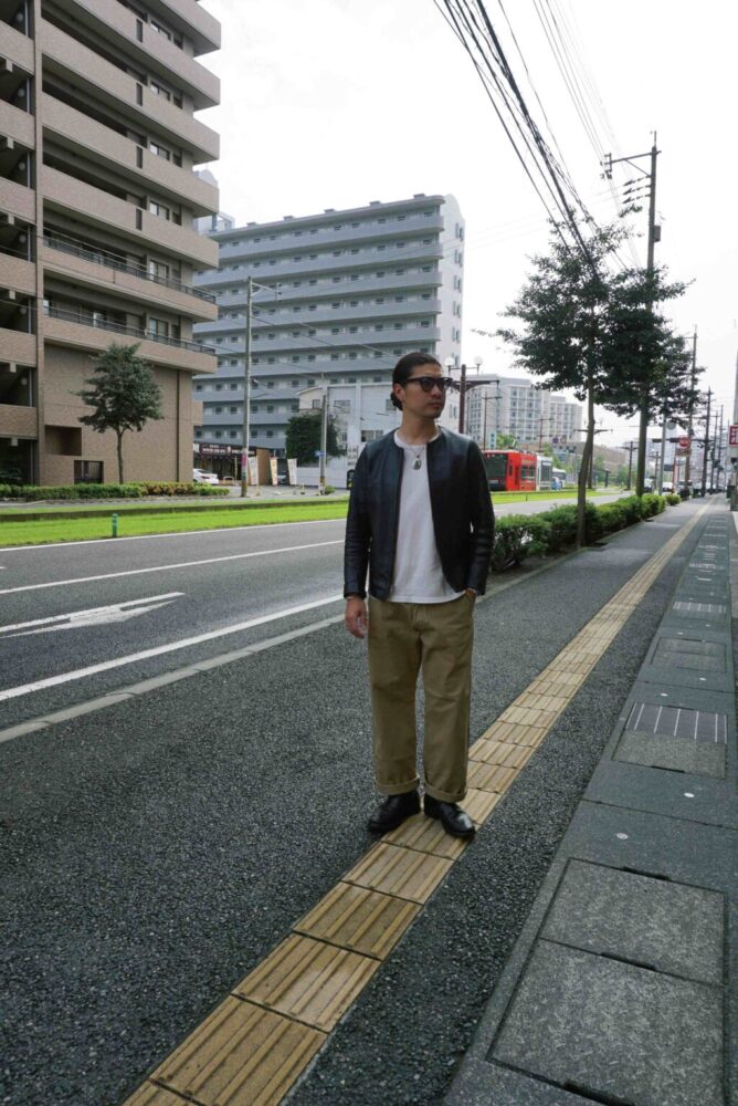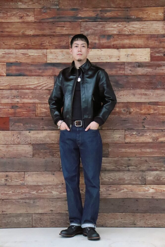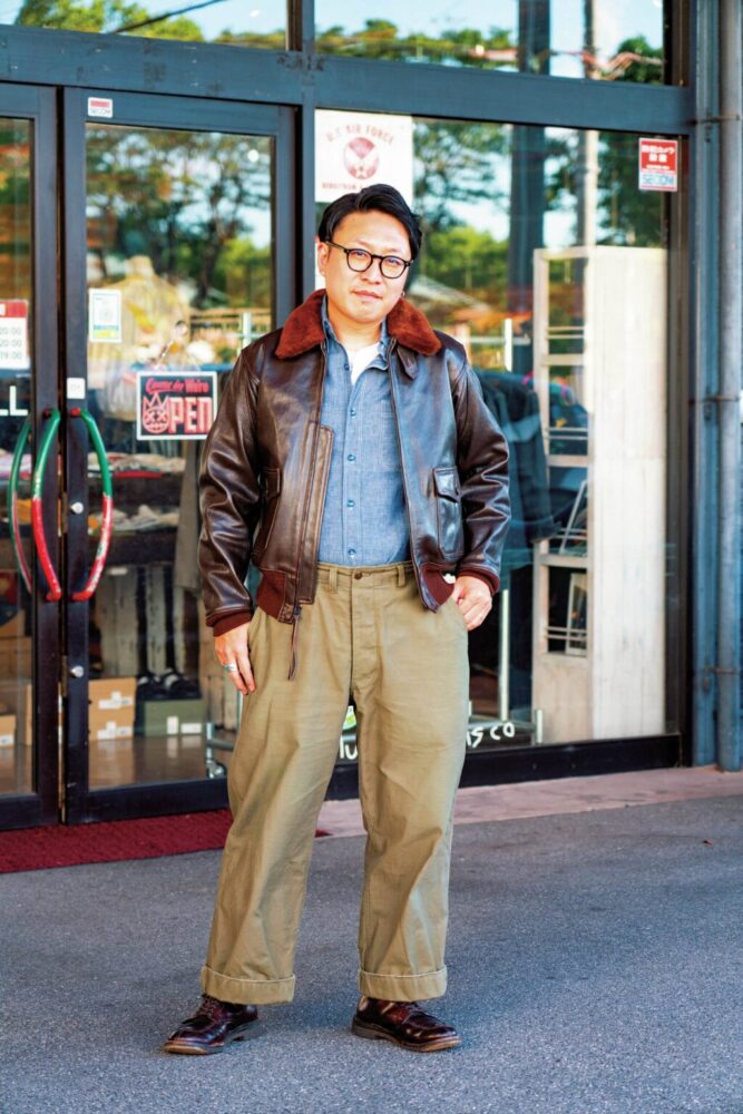 ご自身が務める「ろーぐす」でも今年問い合わせが多いと言うタイプG-1。ゴートスキンは新品の状態から柔らかく着やすいところは非常に魅力的。1940年代のUSNの着方をイメージしてつつ、サイズ感など現代っぽく着こなして愛用しているそうだ。