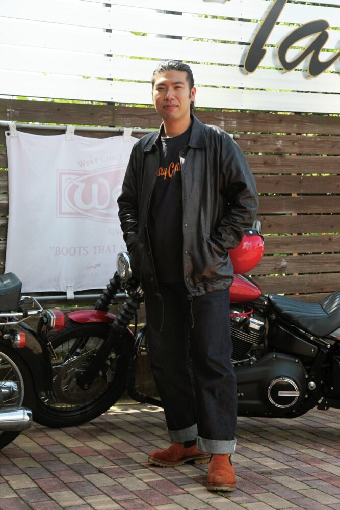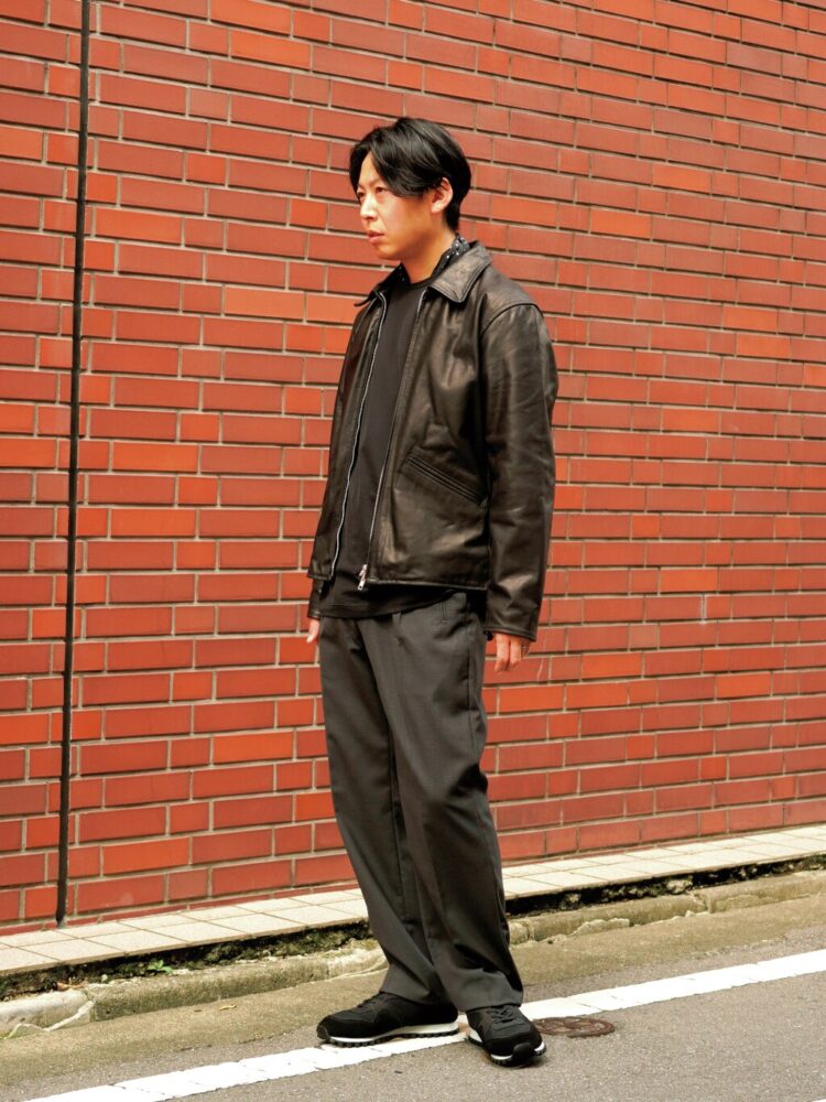オールブラックのコーディネートを得意とする名店アークネッツのプレスを務める富田さん。別注した襟付きのシングルライダースは、ツヤ感のあるホースハイドを使用。通常のカールトンジャケットよりも着丈を長くすることで、よりカジュアルな印象に。