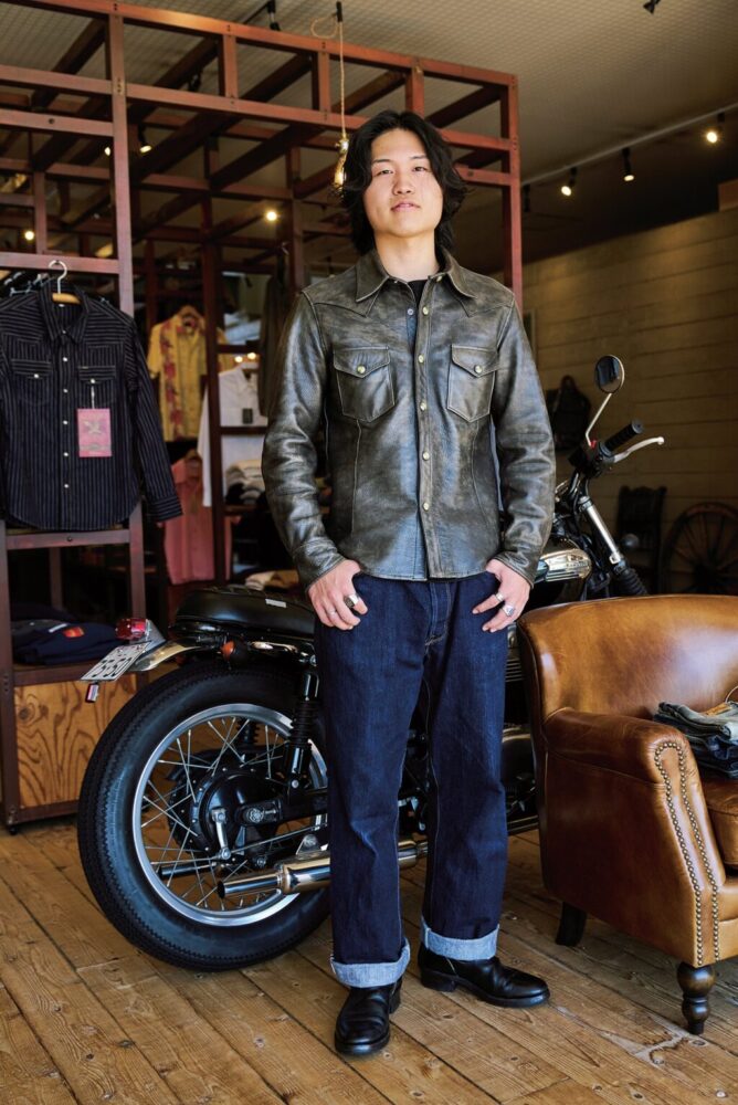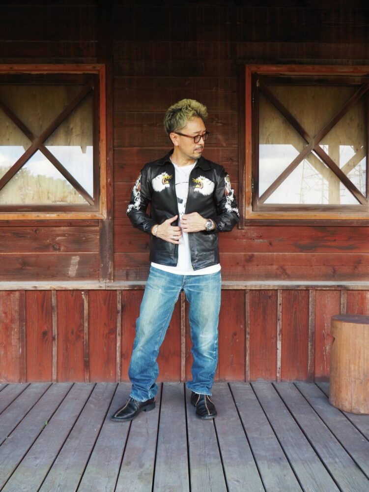 岐阜の名店「フィリップ66」のオーナー林さんが着用するのは、薄く漉いた馬革に刺繍を施した“レザースカジャン” ノーフォーク。押し出しの強いジャケットだけに、コーディネイトはシンプルに、が基本。ホワイトTシャツに首元にさりげないネックレスを配し、すっきりまとめた。