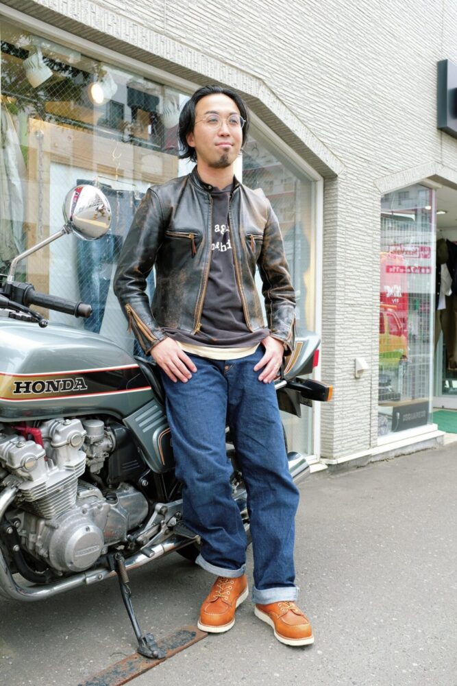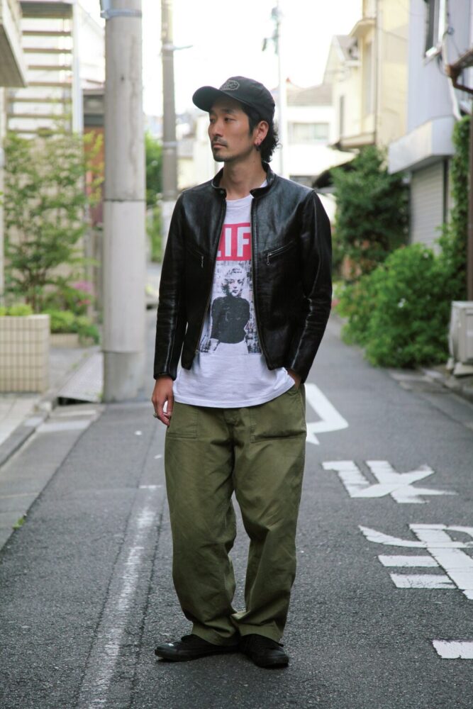 山口県の名セレクトショップ「マンボ」から登場の篠田さん。’60年代のシングルライダースがモチーフのシンプルなジャケットをストリート風に着こなした好例。ジャストのジャケットにゆったりしたグラフィックTのバランスはさすが。パンツの太めのサイズ感にも注目。