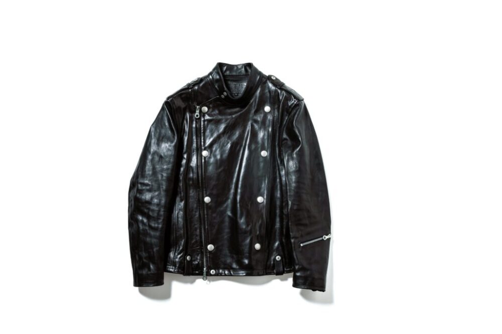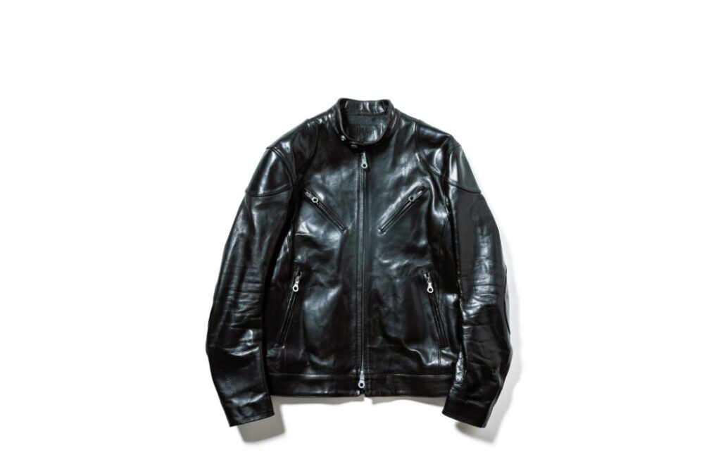 肩、肘のあて革がレーシーな雰囲気を漂わせるシングルライダース。スタンドカラー、フロント4ジップポケットのソリッドなデザインが無骨なバイカースタイルを演出。23万1000円
