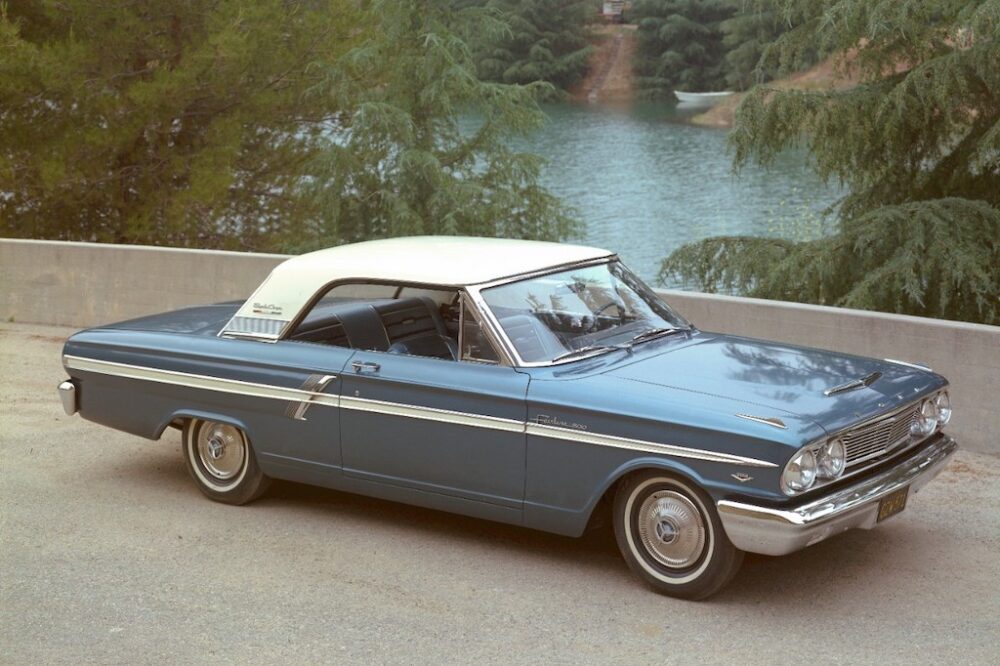 Bピラーが存在せず、この写真のように窓を全開にすれば開放感あふれる2ドアモデルが2ドアクーペと呼ばれるスタイル。後部座席が存在していても、スポーティなルックスになることから、スポーツクーペや2ドアハードトップ、ピラーレスクーペとも呼ばれる。アメリカ旧車のなかではもっとも人気のスタイル。写真は1964年式フォード・フェアレーン・スポーツクーペ(Photo by Ford Motor Company)