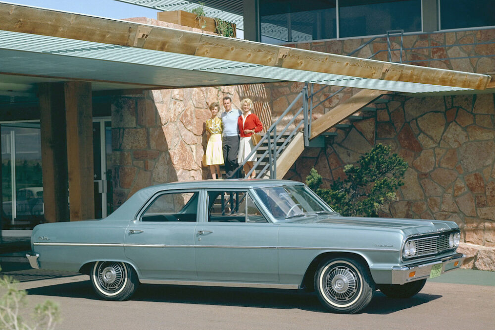 フロントのドア後方にBピラーが存在する4ドアモデルのこと。4ドアモデルのスタンダードなデザインで、いわゆる子どもが絵に描くようなクルマのカタチ。当時のファミリーカーには定番のボディスタイルで、現代になっても生き続けるデザイン。ただし2ドアモデルに比べるとボディサイドが間延びしたように見えるので、スタイルよりも実用性を重んじる人に愛された。写真は1964年式シボレー・シェベル・マリブ・4ドアセダン(Photo by General Motors)