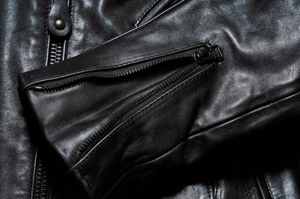 この革の特徴は、オイルを多く含んでおり、とにかく柔らかくて着やすいこと。一般的な革好きが執着する「渋鞣し」「茶芯」の馬革とは真逆の「クロム鞣し」の「黒芯」で、モヒカン小川曰く「大人が頑張らずに着られるライダースを目指した」。初回の受注は先日開催したイベント「レザーズデイ」で終了したが、来年に再受注の予定あり。27万5000円