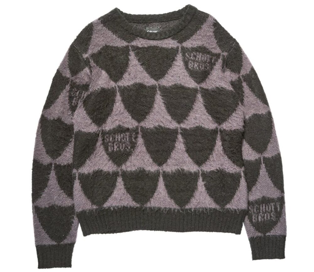 パーフェクトシールドを総柄シャギーニットで表現。アクリル素材のダブルジャガードという編み方でしっかりとした厚みを出し、毛を掻くことによって起きる起毛感が特徴だ。ゆとりのある身幅とすっきりとした着丈の現代的なシルエットにも注目。1万3200円